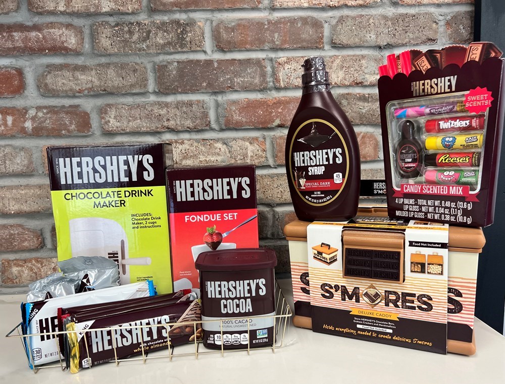 For all those Hershey chocolate lovers 🍫 Fondue set, chocolate drink maker, s’more set, pack of chapstick, chi Kate syrup, coca powder & candy bars!