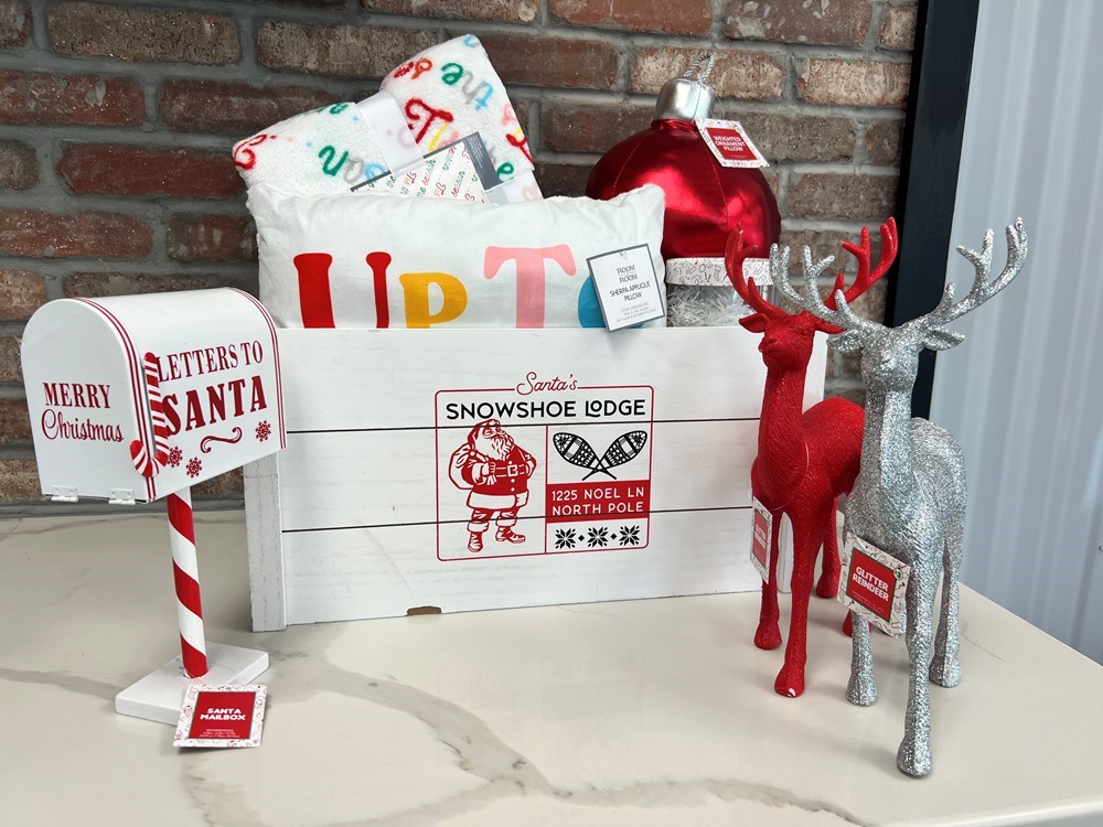 It’s beginning to look alot like Christmas 🎄(2) decorative pillows, Christmas themed throw blanket, (2) glittery reigndeer, faux decorative Santa's mails box, weighted ornament pillow, and mini white desk tree w/mini ornaments.
