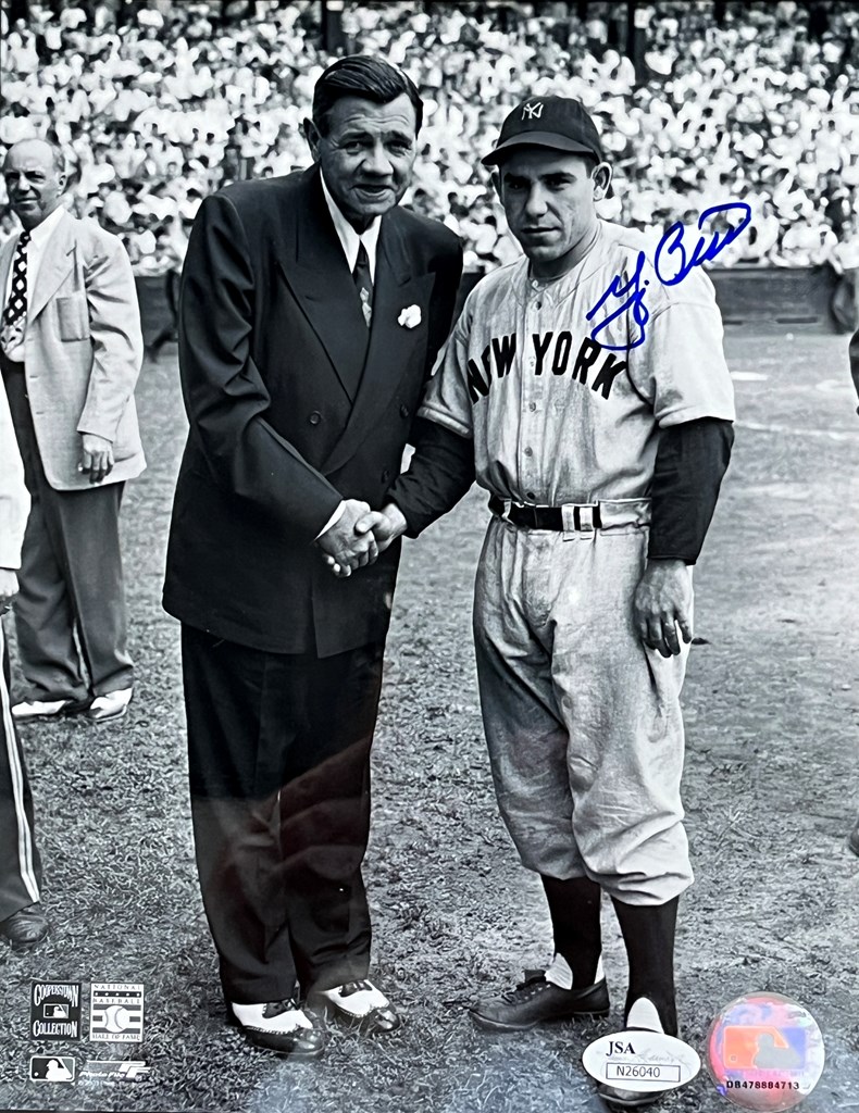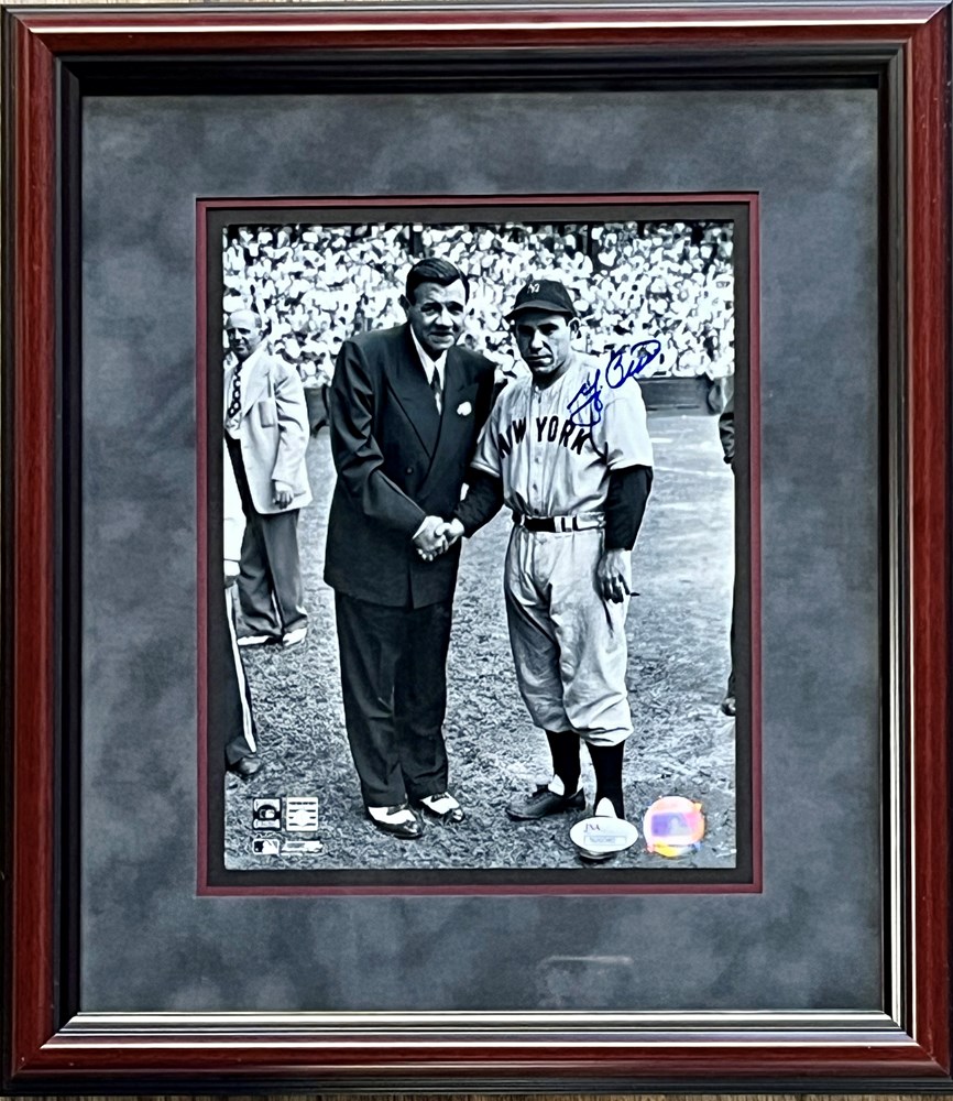 Yogi Berra w/Babe Ruth New York Yankees Signed Photograph by Hall of Famer Yogi Berra Photograph Size 8" x 10" Custom Framed Size: 14" x 16" Comes with a Certificate of Authenticity From JSA Museum Quality Custom Framing Details: Custom framed in a 1" cherry frame triple matted with gray suede outer mat and maroon & black inner matting. 100% acid free matting to museum standards. Enclosed in conservation clear glass 99% UV protection to keep the signature & art from fading. Dust covered backed, wired ready for hanging.