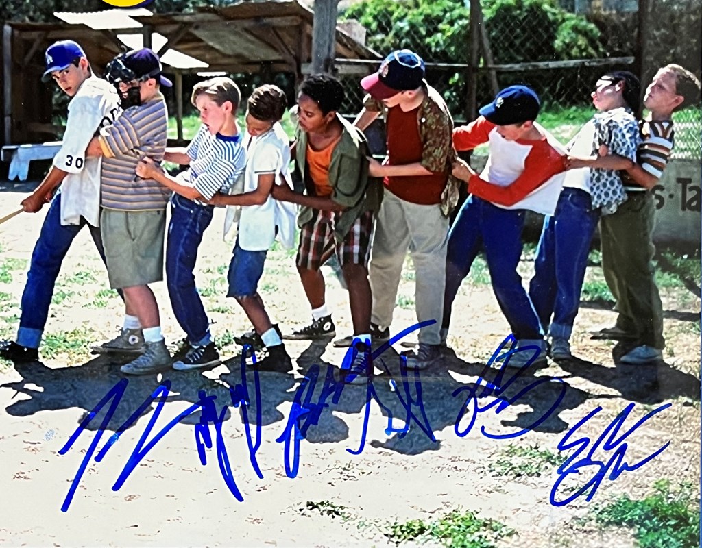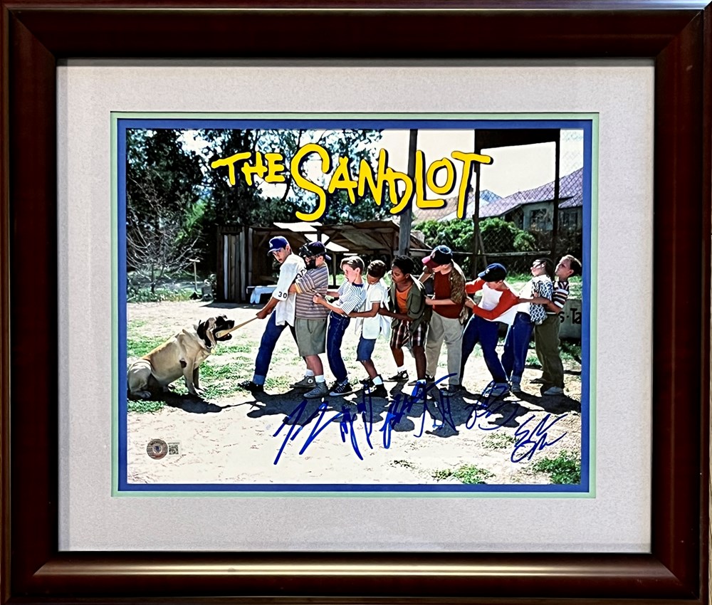 The Sandlot Signed 11x14 photo Color 14" x 11" photo from the iconic comedy “The Sandlot” signed by 7 cast members. The photo is signed by Tom Guirt (Scotty Smalls), Grant Gelt (Bertram), Shane Obedzinski (Tommy), Victor DeMattia (Timmy), Brandon Adams (Kenny DeNunez), and Marty York (Yeah Yeah) Photo comes authenticated by Beckett's Framed size: 23" x 19" Museum Quality Custom Framing Details: Custom framed in a 1" cherry frame triple matted with grey outer mat and blue & aqua inner matting. 100% acid free matting to museum standards. Enclosed in conservation clear glass 99% UV protection to keep the signature & art from fading. Dust covered backed, wired ready for hanging.