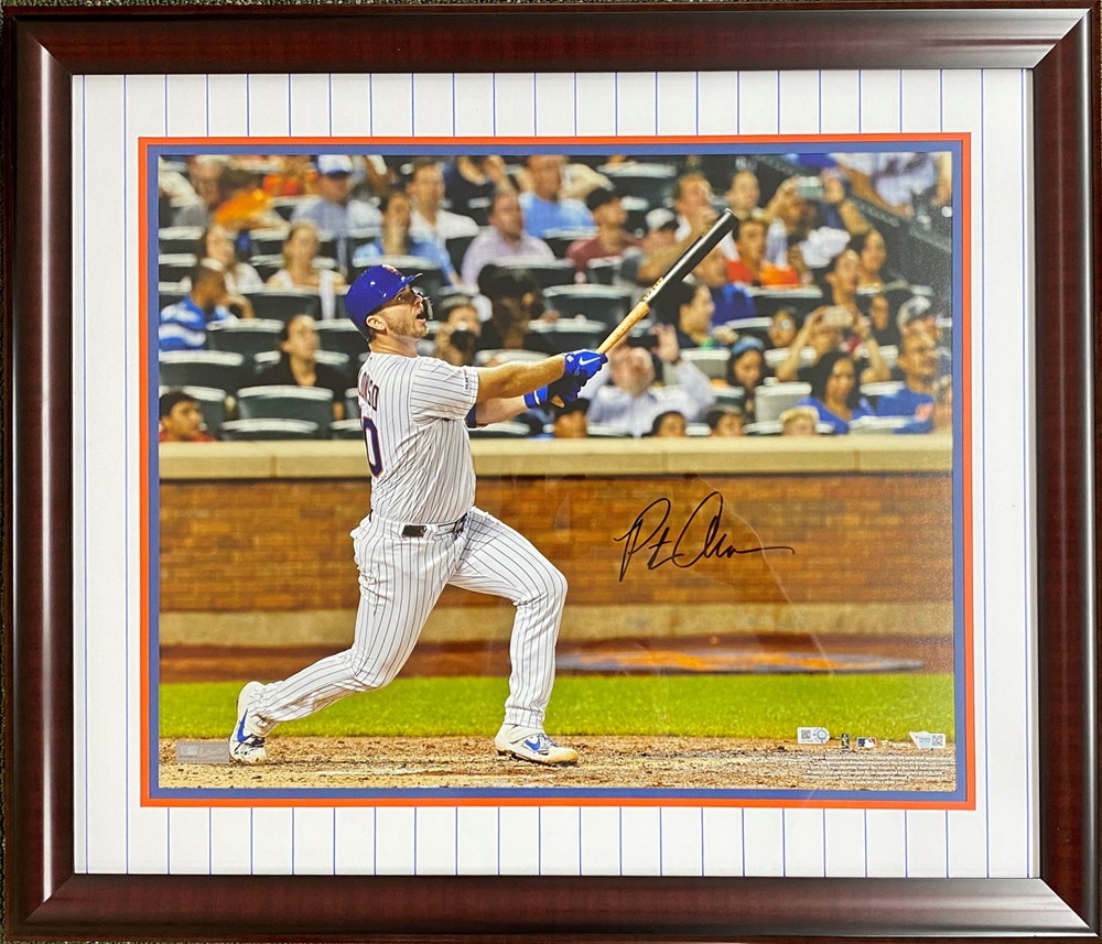 Pete Alonso New York Mets Signed Photograph by Pete Alonso Photograph Size 16" x 20" Custom Framed Size: 27" x 23" Comes with a Certificate of Authenticity From Fanatics, Inc. Museum Quality Custom Framing Details: Custom framed in a 1" cherry frame. Triple matted with pinstripe outer mat and Blue & Orange inner matting. 100% acid free matting to museum standards. Enclosed in conservation clear glass 99% UV protection to keep the signature & art from fading. Dust covered backed, wired ready for hanging.