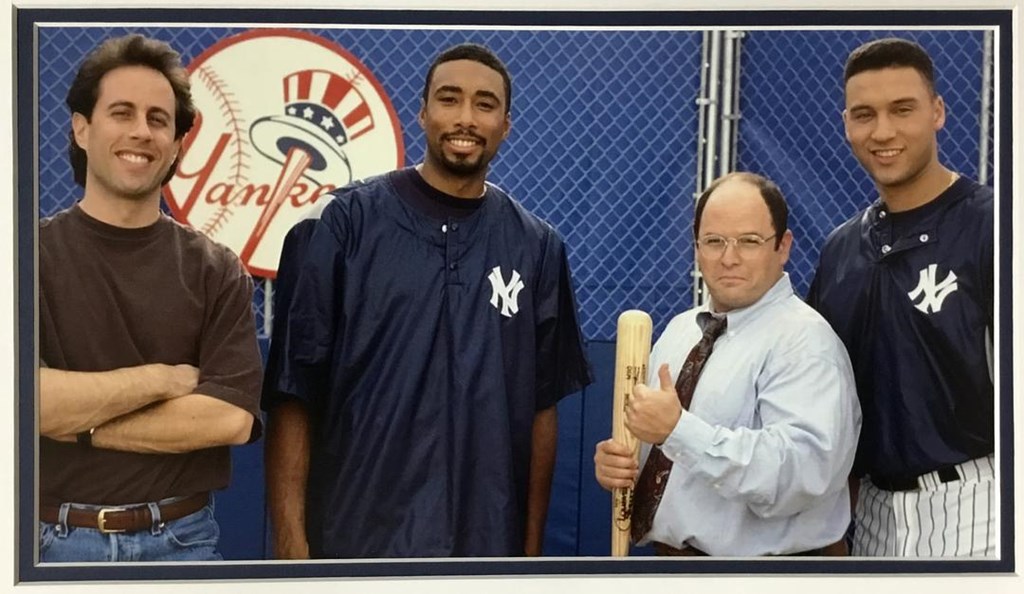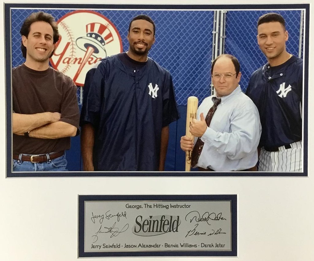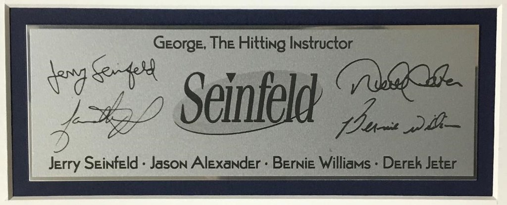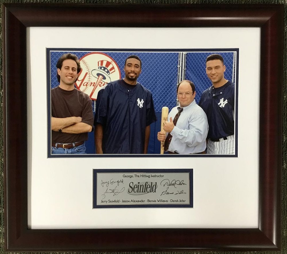 Seinfeld TV Series - New York Yankees George The Hitting Instructor Laser Engraved Signature Series Signatures: Jerry Seinfeld - Jason Alexander - Bernie Williams - Derek Jeter Image Size 8" x 14" Custom Frame Size 18" x 20" Custom Laser Engraved Signature Plaque Museum Quality Custom Framing Details: Custom Framed in a 1: cherry frame, double matted with white outer mat and blue suede inner mat. 100% acid free matting to museum standards. Enclosed in conservation clear glass 99% UV protection to keep the art from fading. Dust covered backed, wired ready for hanging.