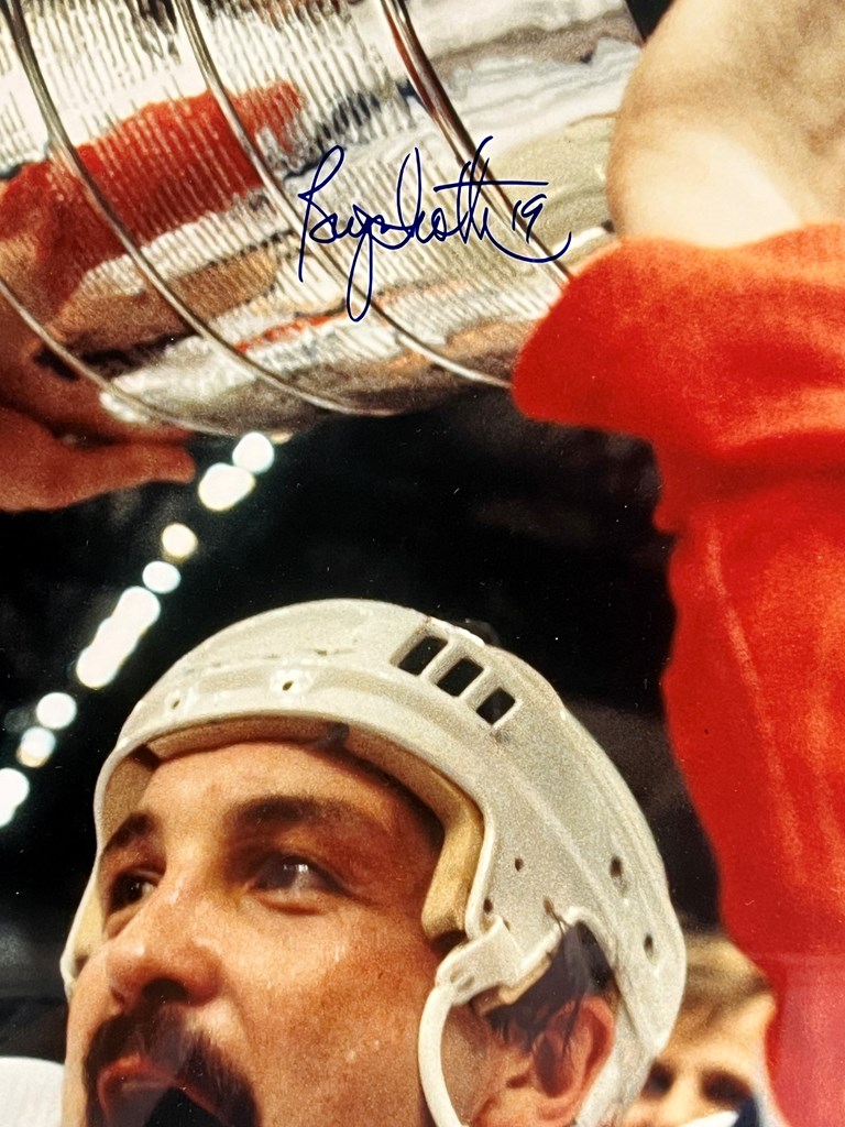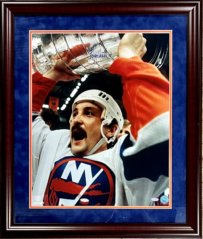Bryan Trottier New York Islanders Signed Photograph by Bryan Trottier Photograph Size 16" x 20" Custom Framed Size: 22" x 26" Comes with a Certificate of Authenticity From Steiner Sports Museum Quality Custom Framing Details: Custom framed in a 2" cherry frame. Double matted with blue suede outer mat and orange inner matting. 100% acid free matting to museum standards. Enclosed in conservation clear glass 99% UV protection to keep the signature & art from fading. Dust covered backed, wired ready for hanging.