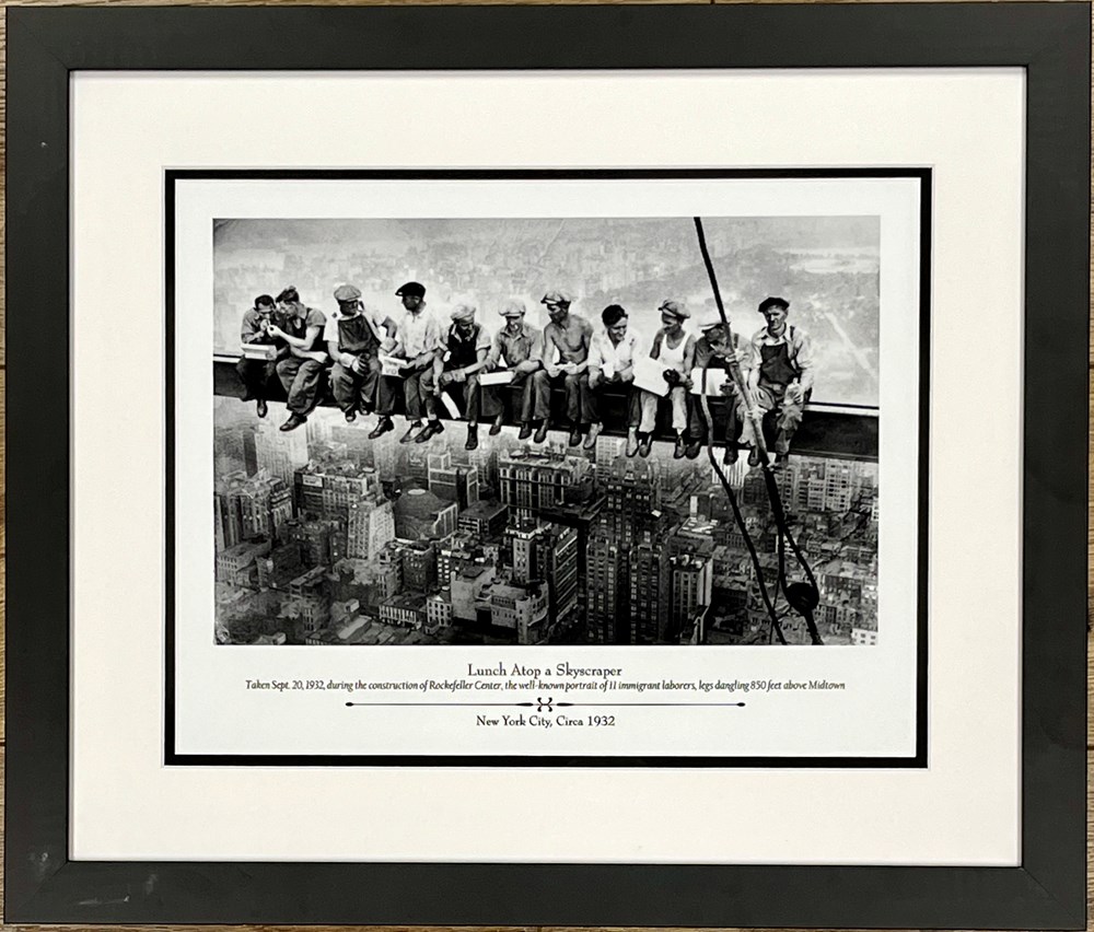 Lunch Atop A Skyscraper Image Size 11" x 14" Custom Framed Size 17" x 20" Beautiful Reproduction on Fine Art Quality Paper Custom Framed in a 1" Black Frame Double Matted with White Outer Mat and Black Inner mat All of Our Framing Materials are 100% Acid Free to Museum Standards Enclosed in Glass, Dust Covered Backed, Wired Ready for Hanging These are Professionally Custom Framed Not Store Bought Ready Made Frames